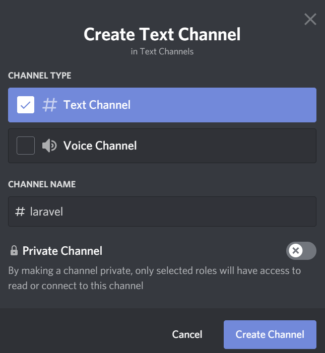 Setelah itu, atur saluran ke 'Saluran Teks', pilih nama saluran dan pilih apakah Kita ingin saluran tersebut menjadi pribadi atau tidak: