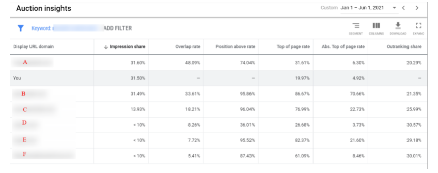 Salah satu cara yang baik untuk melacak persaingan PPC Kita Adalah Laporan Wawasan Lelang (Auction Insight report) di dashboard Google Ads. Harapan nya adalah agar selalu berada di depan kompetitor Kita dengan adanya laporan ini, Kita dapat mengambil langkah ekstra untuk mendapatkan hasil yang diinginkan secara keseluruhan.