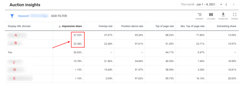 Faktor seperti setelan penargetan, Bidding, dan Quality Score, mempengaruhi pangsa tayangan. Namun, ini dapat membantu memahami apakah kompetitor ngebid kata kunci.