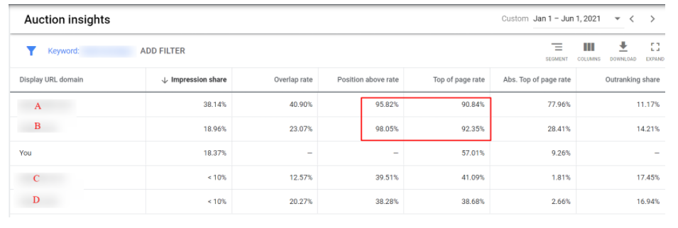 Namun perhatikan satu hal, data ini tidak tergantung pada apakah iklan Kita ditampilkan pada waktu yang sama atau tidak. Jadi, kemungkinan besar untuk kompetitor A (terlihat pada cuplikan di atas dengan rasio halaman bagian atas 90%), iklan Kita mungkin ditampilkan secara bersamaan