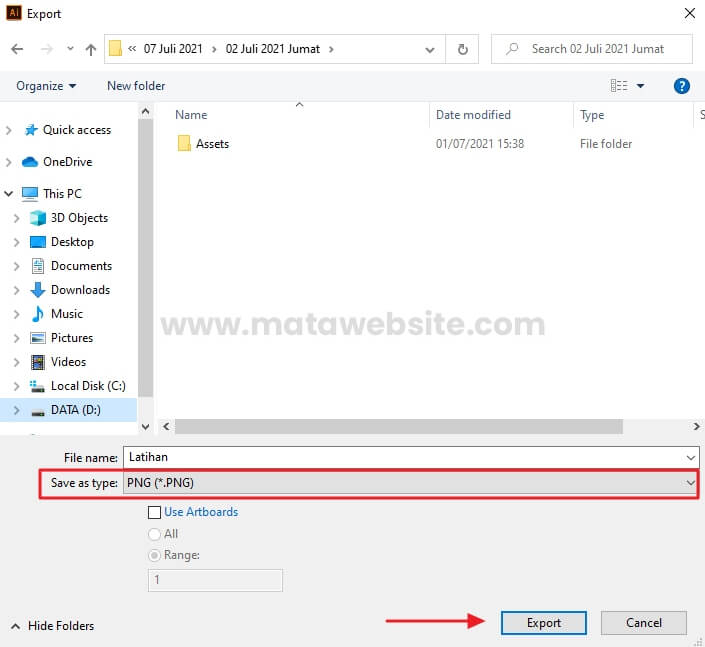 Tinggal pilih mau simpan desainnya dimana, lalu pilih formatnya menjadi PNG dan klik Export.