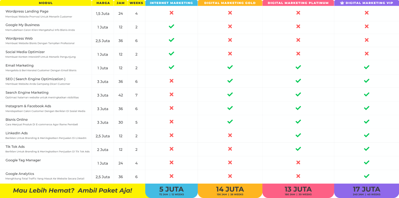 Untuk promosi digital ini, anda juga bisa mengambil paket terpisah sesuai dengan pilihan anda. Namun untuk diskon pemesanan hanya paket all-in pembelajaran saja yang bisa di dapatkan.